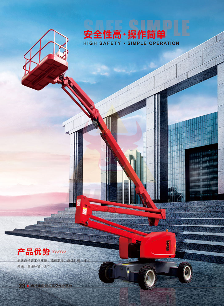 曲臂式高空作業(yè)平臺具有伸縮臂,能懸伸作業(yè),跨越一定的障礙或在一處升降可進行多點作業(yè);升降平臺移動性好,轉移場地方便;外觀美觀,適于室內外作業(yè)和存放。