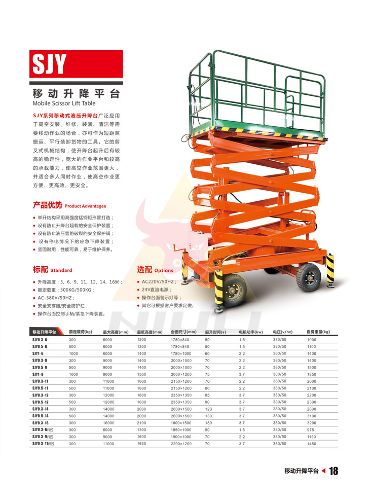 SJY系列移動(dòng)式液壓升降臺(tái)廣泛應(yīng)用于高空安裝、維修、裝潢、清潔等需要移動(dòng)作業(yè)的場(chǎng)合,亦可作為短距離搬運(yùn)、平行裝卸貨物的工具。它的剪叉式機(jī)械結(jié)構(gòu),使高空作業(yè)更方便、更高效、更安全。