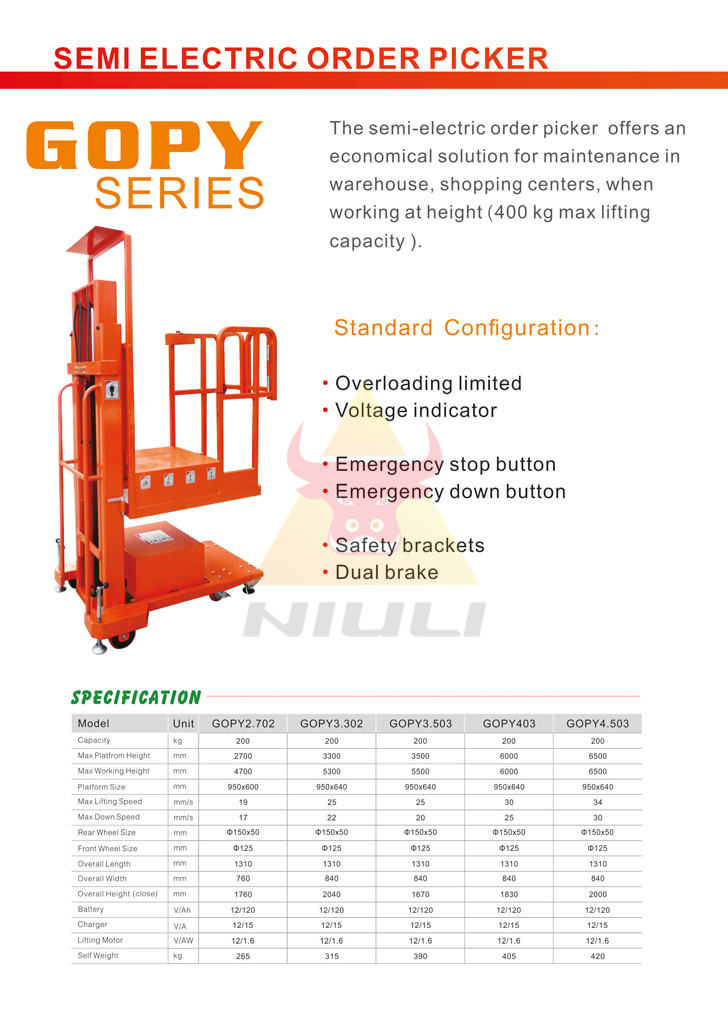 The semi-electric order picker offers an economical solution for maintenance in warehouse,shopping centers,when
